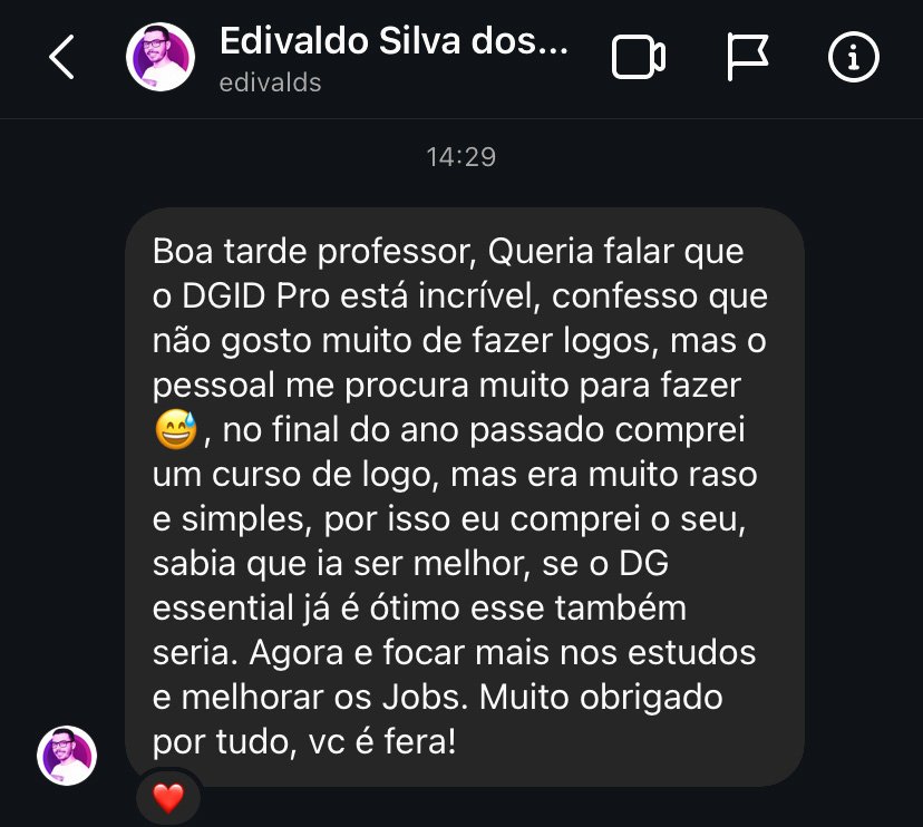 Você já domina o básico, mas está preso em projetos de baixo valor. No DG ID PRO, vai aprender a criar marcas com estratégia, conceito e valor — e sair do ciclo dos logotipos baratinhos.